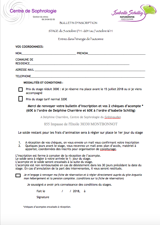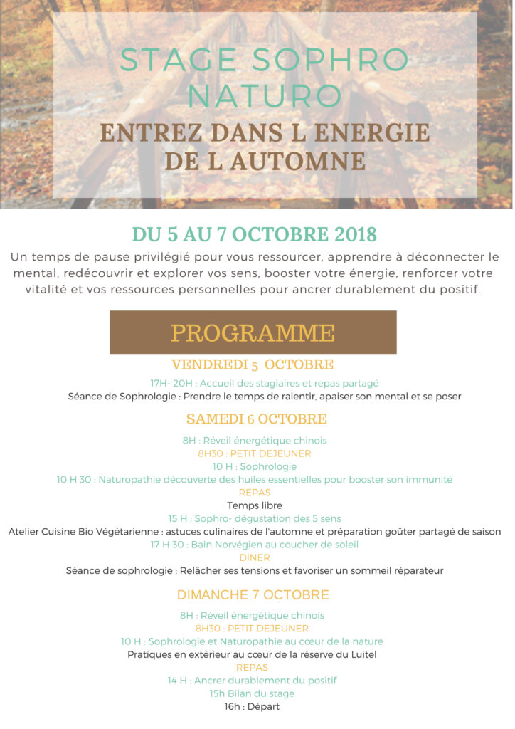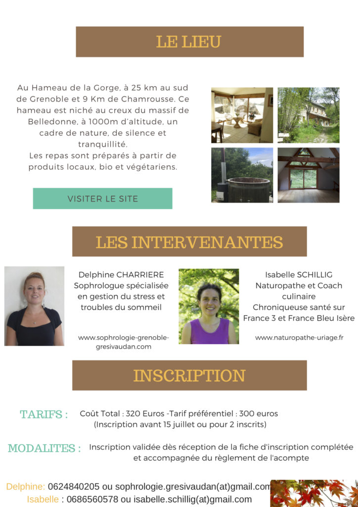 Alors venez participer à un super stage alliant Sophrologie et Naturopathie, Delphine Charriere Sophrologue et Isabelle Schillig Naturopathe Uriage et Grenoble, deux expertes dans leurs domaines qui allient leurs compétences pour vous chouchoutez et Entrez en douceur dans l’énergie de l’automne ! Dans un lieu privilégié au cœur de la nature.