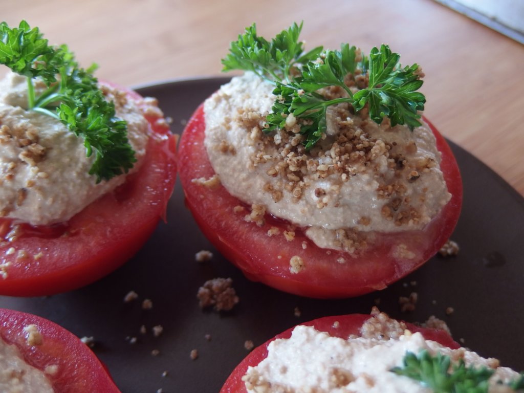 Voici une idée de présentation très classique avec des tomates, le Houmous est assez passe-partout et pourra se mettre sur des toasts ou crackers de riz, s’emmener en pique-nique, servir d’entrée avec des petits légumes…. A vous de donner libre cours à votre création….