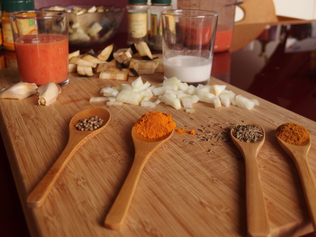 Mesurer avec une tasse ou un verre 1 volume de millet pour 1,5 volume d’eau. Faire bouillir l’eau, rajouter un filet d’huile d’olive qui permettra d’aéréer la céréale et le volume de millet. Faire cuire pendant 20 minutes sur feu doux. Cette céréale est parfaite pour cette recette car elle va absorber le jus du curry.