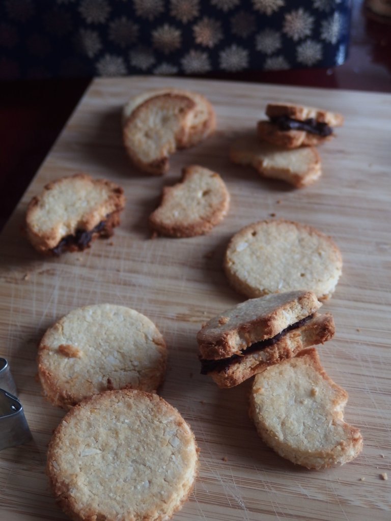 Dernière recette cette année autour des biscuits de Noel. On obtient des biscuits parfumés à la noix de coco et fourrés au chocolat… parfait pour une pause gourmande.