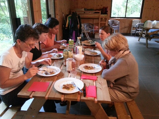 Après avoir dégusté des jus de légumes (facto-fermentés et stérilisés), nous avons préparé du panisse apportant des protéines à notre repas, une grande galette de légumes à l’orge et pour finir un gâteau à la carotte nappé de chocolat noir. Pour les plus gourmands des bouquets de fruits au chocolat ont accompagné l’infusion de Tilleul.