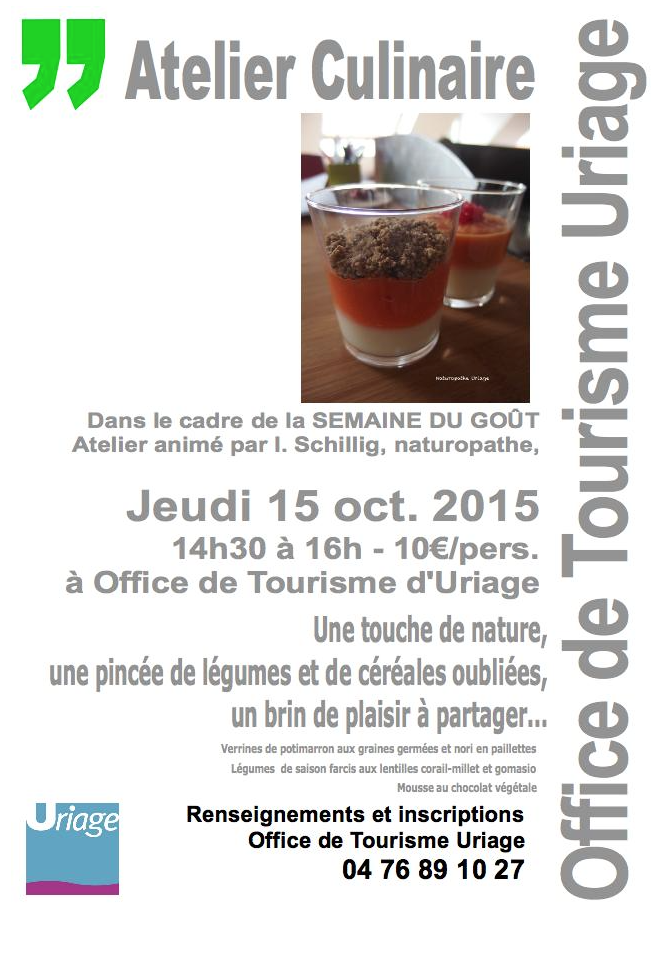 Pour la semaine du Goût, je proposerais un atelier culinaire “Palette de couleurs” le jeudi 15 octobre de 14h30 à 16h à l’office du Tourisme d’Uriage. Les préparations réalisées seront à cuire à votre domicile, pensez à emporter des récipients hermétiques. (voir affiche)