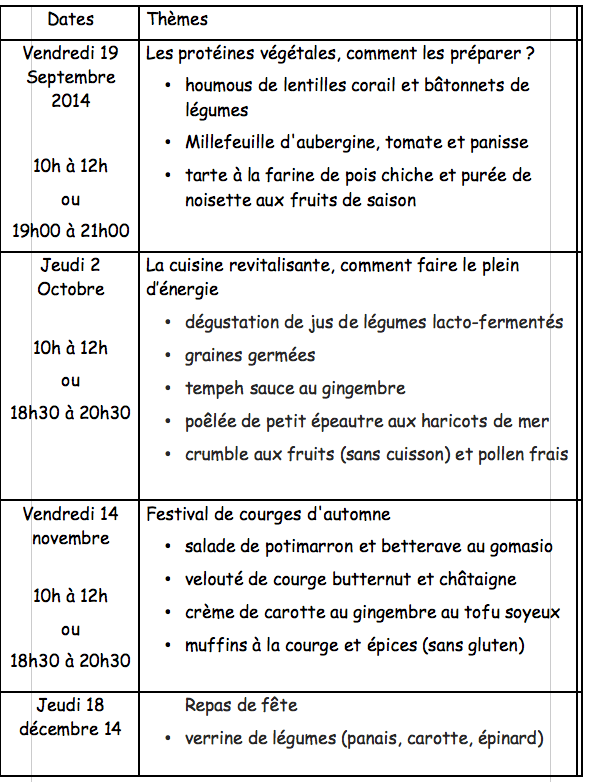 Cours de cuisine, réalisation de plats équilibrés autour d’un thème donné , fait avec des produits locaux voir Biologique (dans la mesure du possible), à base de légumineuses ou protéines végétales.