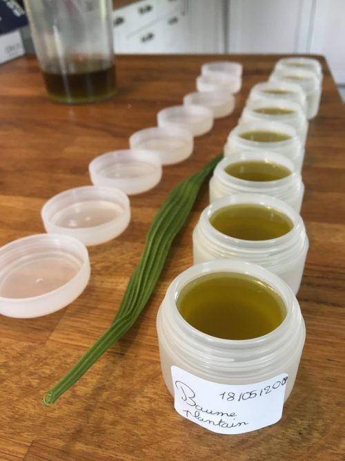 Cueillir du plantain (n’importe qu’elle variété) et le faire un peu flétrir pendant quelques heures. Stériliser un bocal en verre (solide avec couvercle) en mettant de l’eau bouillante dedans et sur le couvercle. Puis rajouter les feuilles de plantain un peu fanées et recouvrir d’huile de tournesol ou sésame. Mettre en guise de couvercle une compresse stérile aussi appelée de la gaz. Laisser macérer pendant 3 semaines en évitant le contact direct avec le soleil.