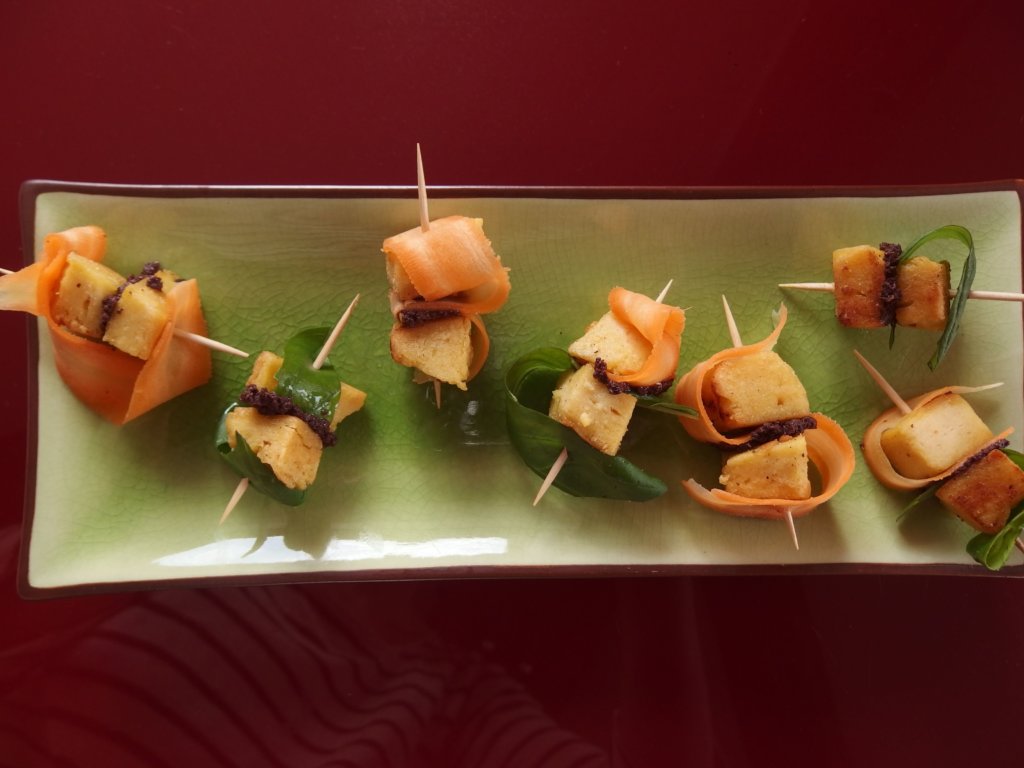 Pour la décoration sur cure-dent ou autre pique de votre choix, j’ai utilisé de la carotte épluchée avec l’économe (couteau à peler), des feuilles de basilic frais et de la tapenade à l’olive noire pour saler un peu mon entrée.